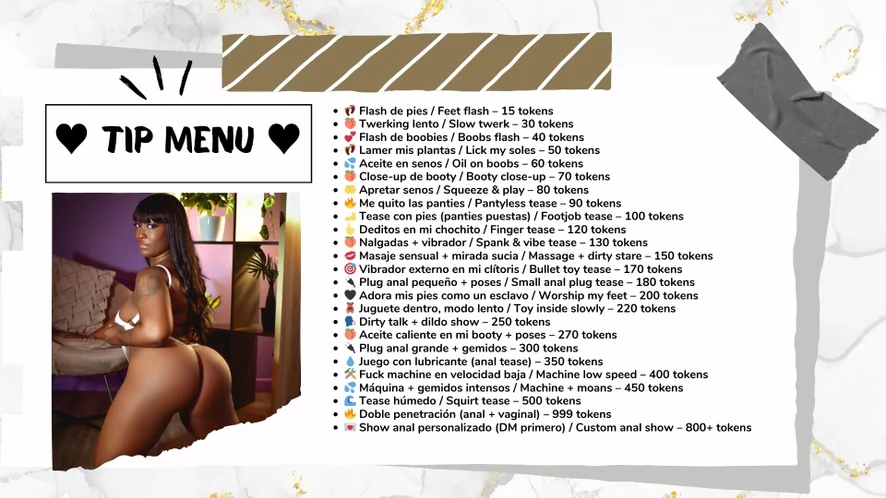 Раком, Шоу с маслом, Эротические танцы, Мастурбация пальцами, Дилдо или вибратор, Грязные разговоры, Стриптиз, Минет, Секс-игрушки, Верблюжья лапка, Ахэгао, Фут-фетиш, Каблуки, Анал, Душ, Кляп, Глубокая глотка, Между грудей, Сквирт, Тверкинг, Курение, Мастурбация, Шлепки, Двойное проникновение, Жёсткий секс, Дрочка рукой, Анальные игрушки