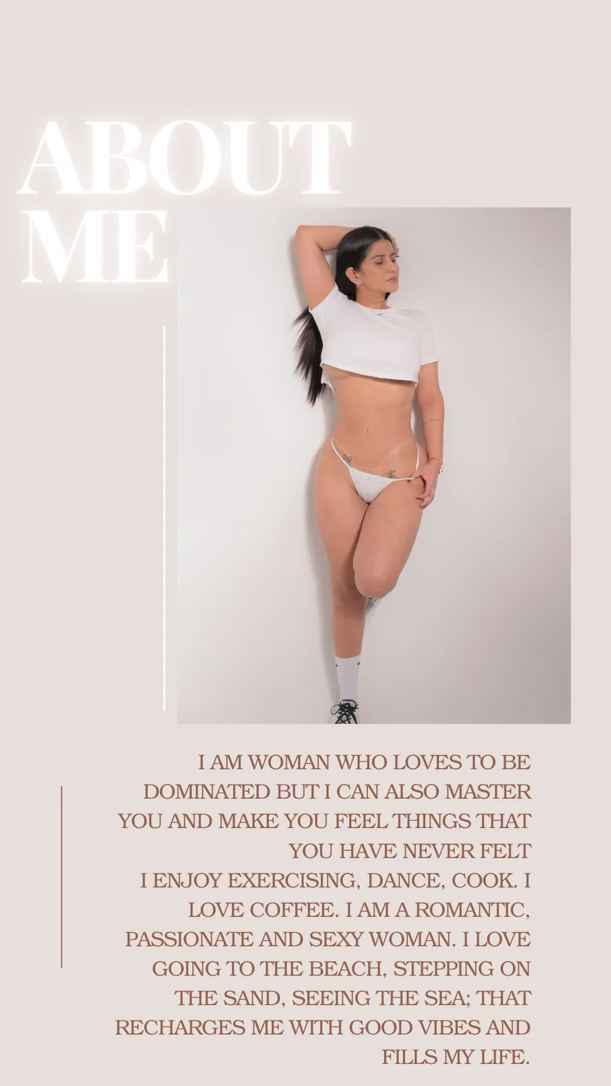 Эротические танцы, Стриптиз, Шоу с маслом, Душ, Секс-игрушки, Минет, Грязные разговоры, Дилдо или вибратор, Между грудей, Мастурбация пальцами, Мастурбация, Глубокая глотка, Шлепки, Верблюжья лапка, Игрушки для сосков, Жёсткий секс, Топлесс, Поза наездницы